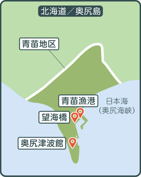津波と火災で壊滅的な被害を受けた青苗地区では、その後、災害に強い漁港づくりを目指してさまざまな施設が整備されました。その一つが青苗漁港に建造された「人工地盤」です。高さ約6メートル、全長約160メートルにも及ぶ巨大な避難用高台で、漁港で働く漁業者が迅速・安全に避難し、津波から身を守るために活用されています。地震から8年後の2001年には、島南部の徳洋記念緑地公園内に奥尻島津波館が完成。こちらは、震災の記憶と教訓を後世に伝えるための施設として、島内の子どもたちの防災学習などに役立てられています。